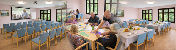 Die Tagespflege öffnet sich in den Nahbereich und ist so aufgebaut, dass ein Teil der Gruppenräumliche - in begrenztem Umfang - zu den therapiefreien Zeiten als Treffpunkt für die Gemeinde geöffnet wird. Hier entstehen lebendige Nachmittage mit Kaffee und Film, Bewegungsangebote, kreative Workshops und Programme zur geistigen Aktivierung. Die Bewohner des Seniorenzentrums sind ausdrücklich dazu eingeladen eigene Ideen mitzubringen und das Angebot aktiv mitzugestalten. Konkret gibt es in der Begegnungsstätte: